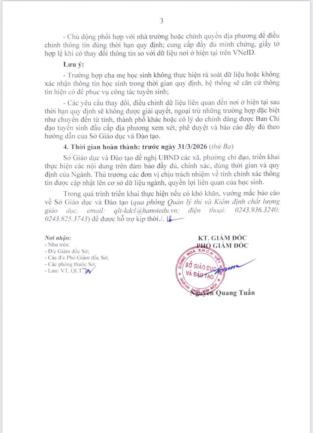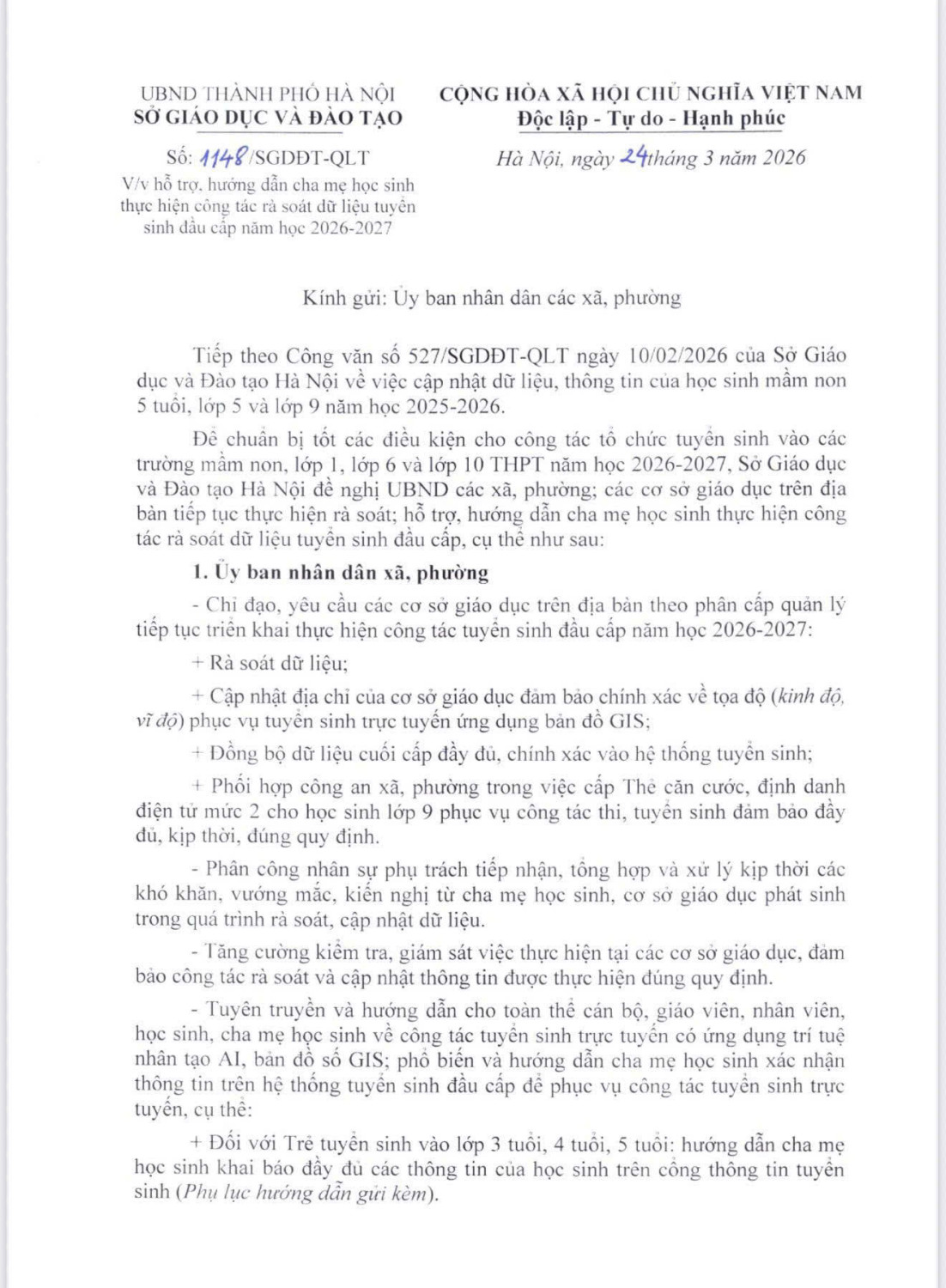 1. Tải file hướng dẫn kèm theo và triển khai đầy đủ các nội dung trong văn bản tới 100% cơ sở giáo dục trên địa bàn; tuyên truyền hướng dẫn cha mẹ học sinh có con trong độ tuổi tham gia tuyển sinh vào cấp học cao hơn trong năm học 2026-2027. 2. Công khai văn bản hướng dẫn số 1148/SGDĐT-QLT trên cổng thông tin và tại đơn vị, phối hợp với các đơn vị, bộ phận liên quan thực hiện tuyên truyền tới toàn bộ người dân trên địa bàn quản lý để nắm bắt thông tin triển khai tại địa bàn đảm bảo tất cả trẻ em đều có quyền lợi, công bằng như nhau trong quá trình thực hiện tuyển sinh. 3. Nghiên cứu kỹ các bước thực hiện trong hướng dẫn để hỗ trợ học sinh tự do (không theo học ở các trường trên địa bàn Hà Nội) trong việc nhập thông tin học sinh, cấp tài khoản và xác nhận thông tin phục vụ công tác tuyển sinh. 4. Chỉ đạo và hướng dẫn các cơ sở giáo dục trên địa bàn: - Thực hiện việc cập nhật thông tin trường, thông tin học sinh đầy đủ, chính xác đảm bảo tiến độ thời gian theo Văn bản số 1148 của Sở GDĐT - Thông tin về nơi cư trú phải nhập theo địa danh thời điểm hiện tại đặc biệt lưu ý về nơi ở, cụ thể: địa chỉ nơi ở phải ghi chính xác số nhà/ngõ/ngách (Căn hộ),.... (thông tin sẽ được đối khớp với dữ liệu dân cư quốc gia dựa trên căn cước công dân, VNeID,...) để phục vụ công tác tuyển sinh. Lưu ý: trong trường hợp không có số nhà, số ngõ ngách,... thì ghi địa chỉ cụ thể nhất để xác định vị trí cư trú của học sinh, VD: + Với Tòa chung cư: Phòng số 1205, Tòa C, Chung cư Time City,..., phường Hai Bà Trưng, thành phố Hà Nội + Với khu vực các xã chưa có số nhà: có thể ghi Đội/Xóm 5/..., Thôn Sơn Trung, xã Quốc Oai, thành phố Hà Nội Công khai văn bản hướng dẫn số 1148/SGDĐT-QLT trên cổng thông tin và tại đơn vị, phối hợp với các đơn vị, bộ phận liên quan thực hiện tuyên truyền tới toàn bộ người dân trên địa bàn quản lý để nắm bắt thông tin triển khai tại địa bàn đảm bảo tất cả trẻ em đều có quyền lợi, công bằng như nhau trong quá trình thực hiện tuyển sinh.